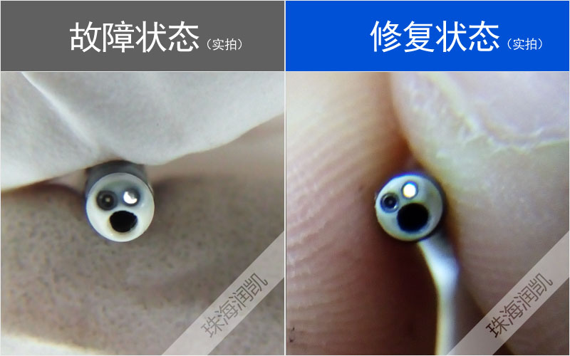 【實(shí)測故障】1.圖像右上方大量黑點(diǎn),有亮點(diǎn);2.導(dǎo)光束暗斷約90%;3.鉗子管漏水;4.彎曲橡皮破損漏水;5.蛇骨崩損;6.角度不足。
